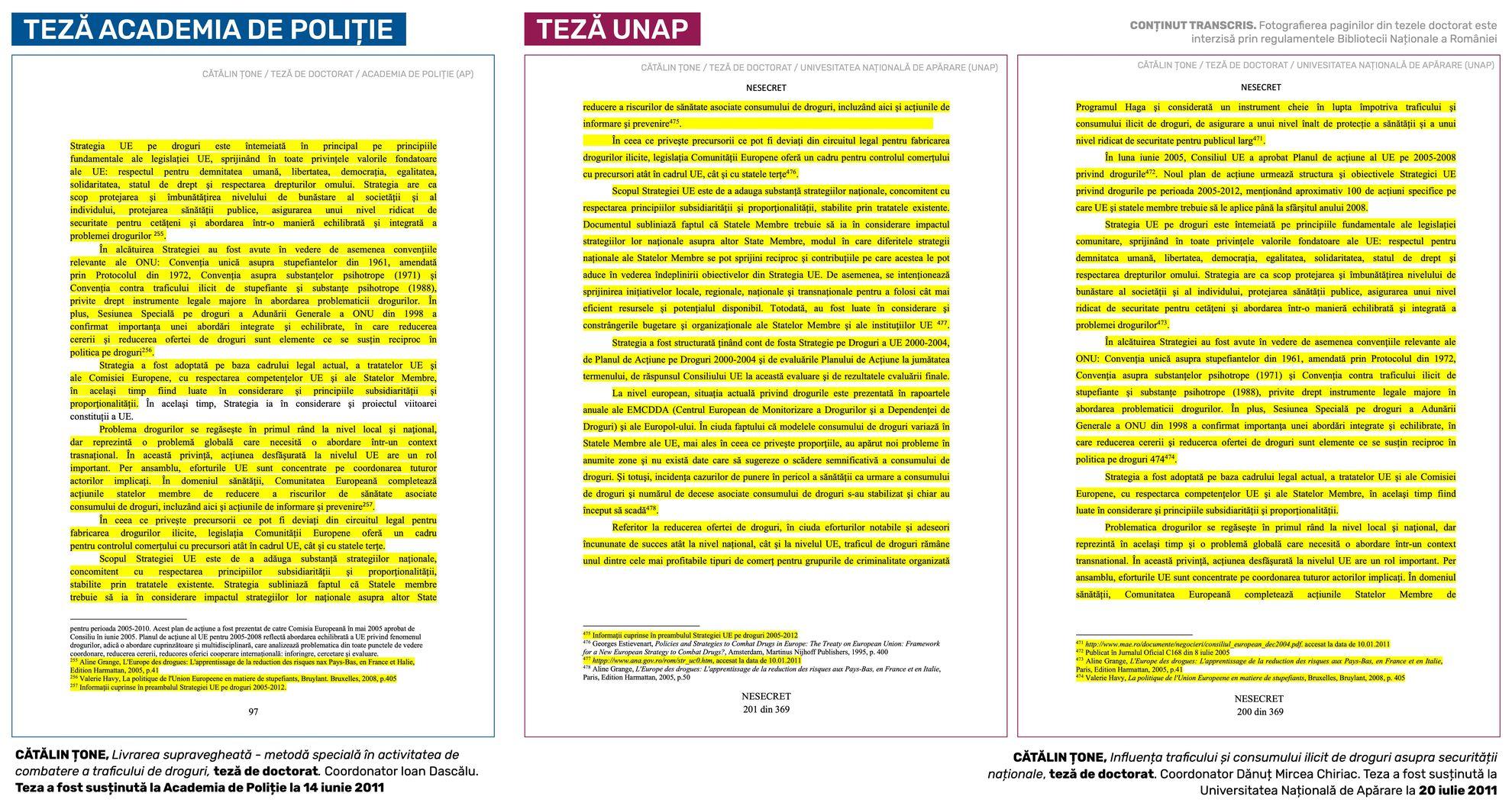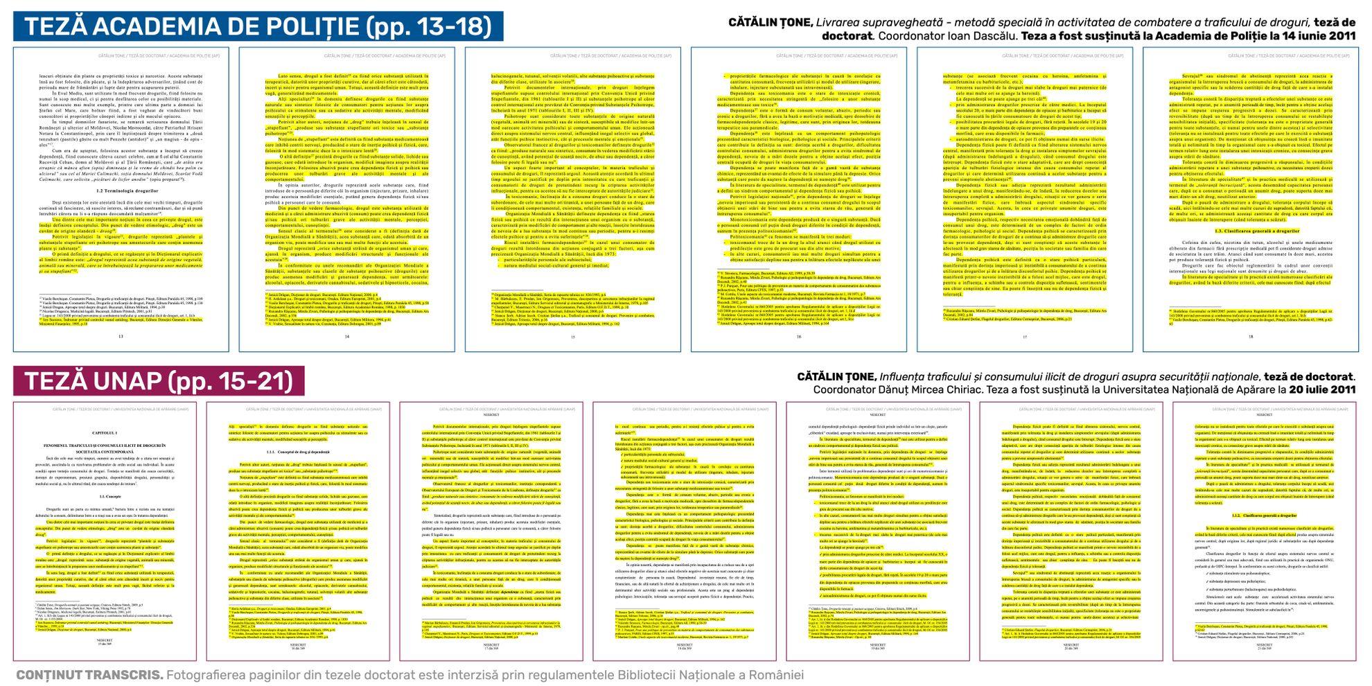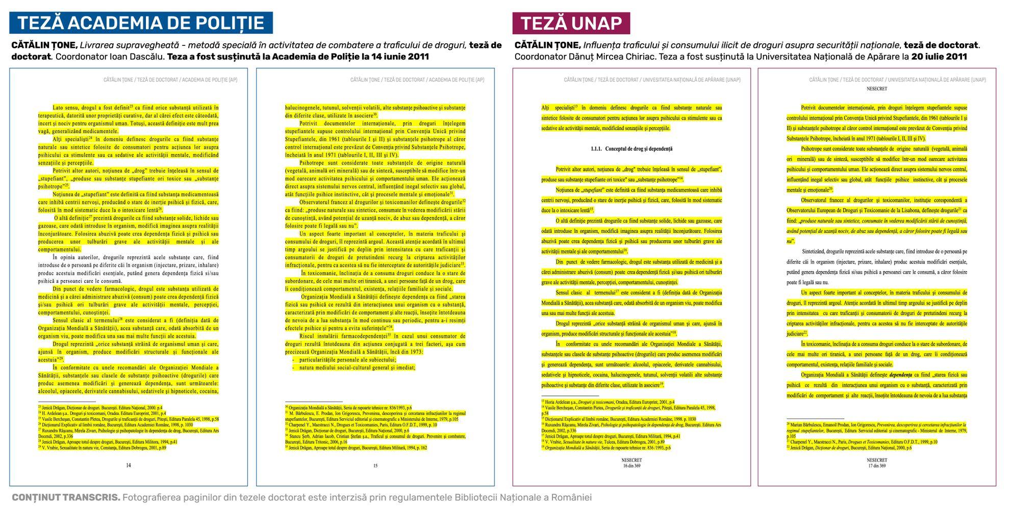 Această secțiune nu numai că este prezentă în ambele teze, însă este și plagiată dintr-o altă teză de doctorat, susținută cu doi ani mai devreme la Academia de Poliție, coordonată tot de Ioan Dascălu, îndrumătorul lui Cătălin Țone. Detalii despre dovezile de plagiat în cele două teze de doctorat ale fostului șef al Serviciului Antidrog din Poliția Capitalei veți putea citi mâine, într-un articol distinct.