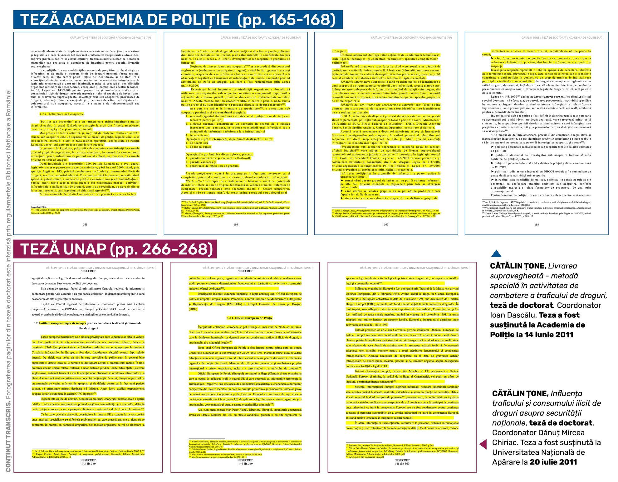 În unele cazuri, pasaje de text care apar ca note de subsol în teza de la Academia de Poliție sunt introduse în corpul textului în lucrarea de la UNAP. În general, este vorba despre porțiuni de text în care sunt exemplificate cazuri concrete de trafic de droguri instrumentate de Poliția Română sau de alte agenții de investigare din străinătate.