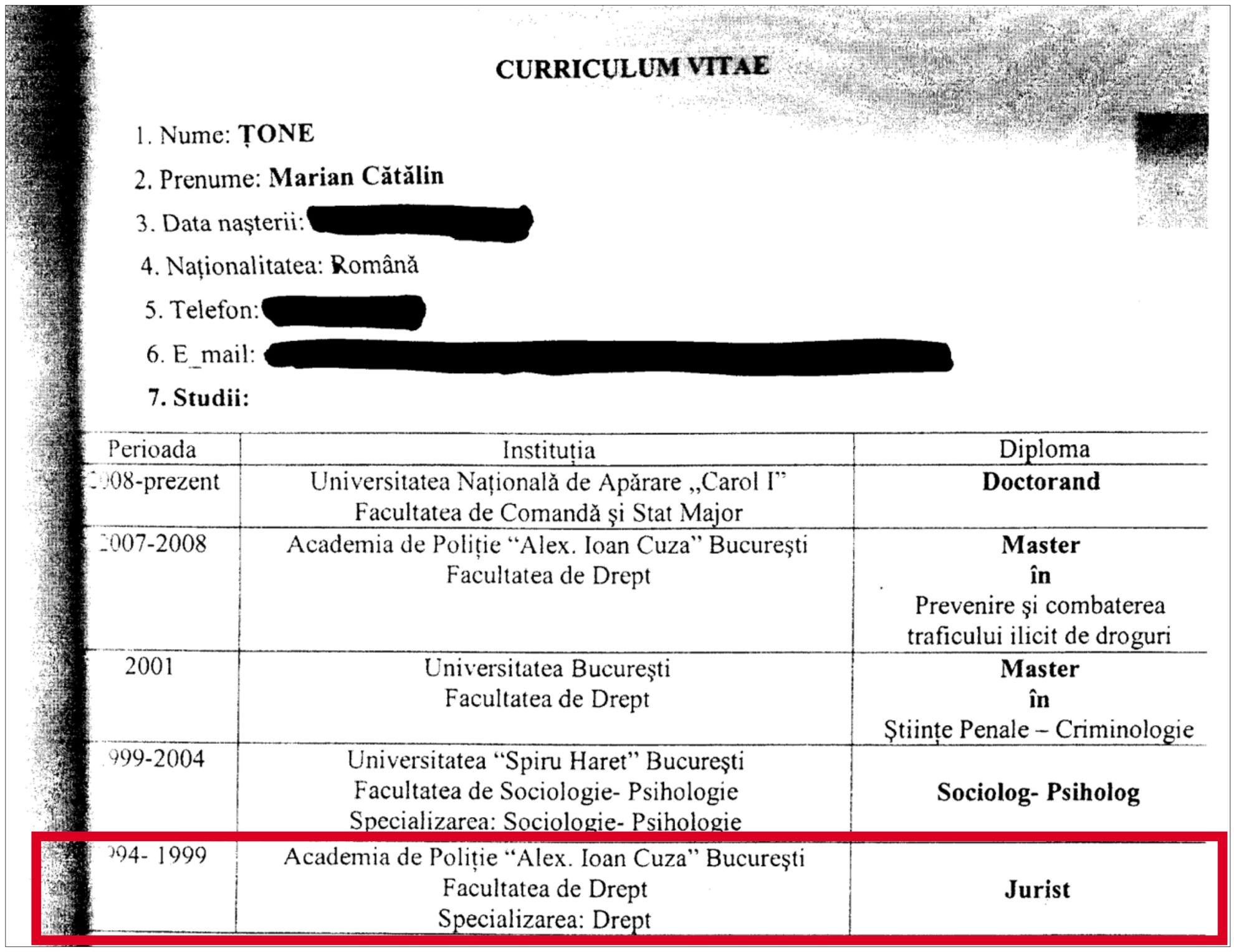 Tot în CV, Țone afirmă că în intervalul 1994 - 1999 a urmat Academia de Poliție, Facultatea de Drept, specializarea „Drept”.