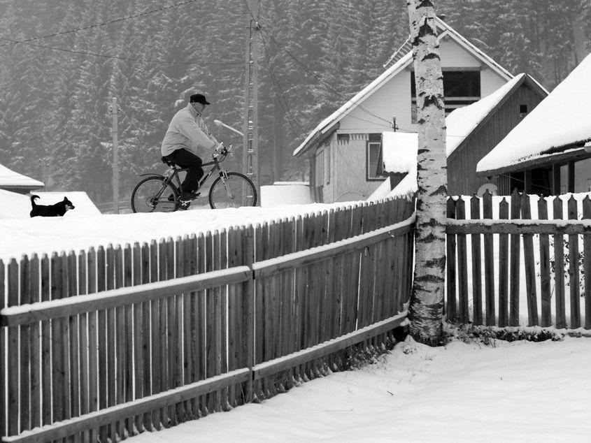 Pedalează prin omăt calm, fără sincope, fără regrete, mereu împăcat cu sine și cu lumea.