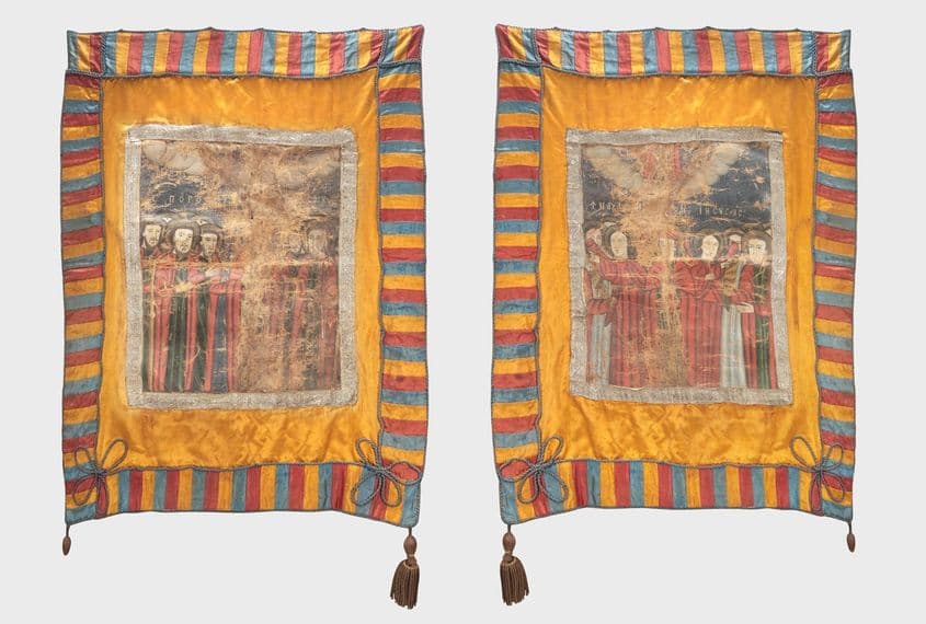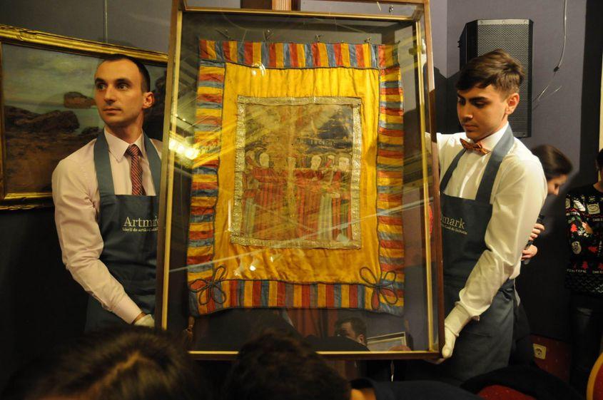Avram Iancu și-a organizat trupele după modelul legiunilor romane. Drapelul vândut la licitația din 3 februarie – realizat din pânză, mătase și broderie din fir de argint – reprezenta steagul de luptă al uneia dintre aceste legiuni. Potrivit Casei Artmark, partea centrală a drapelului „ilustrează apelul la protecția divină, prin invocarea unor figuri ale panteonului ortodox, grupate în jurul Mântuitorului”. (Fotografie: artmark.ro)