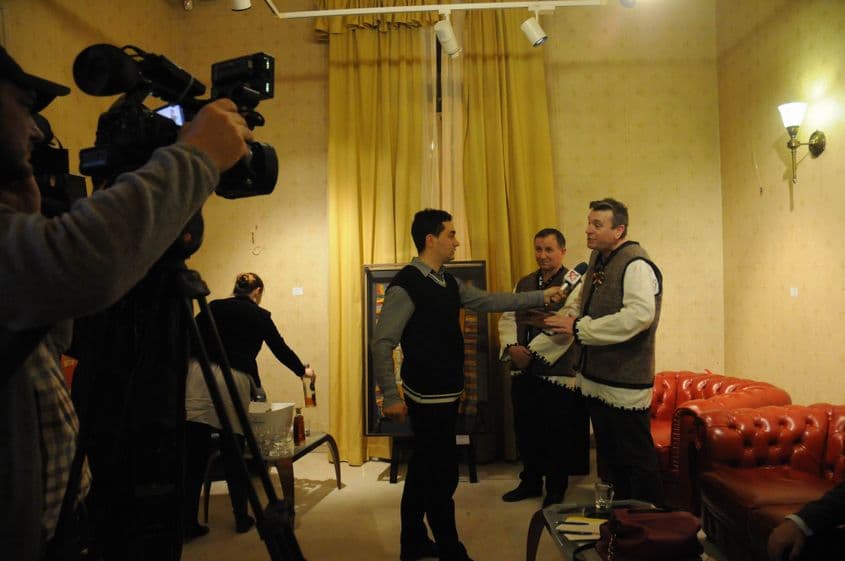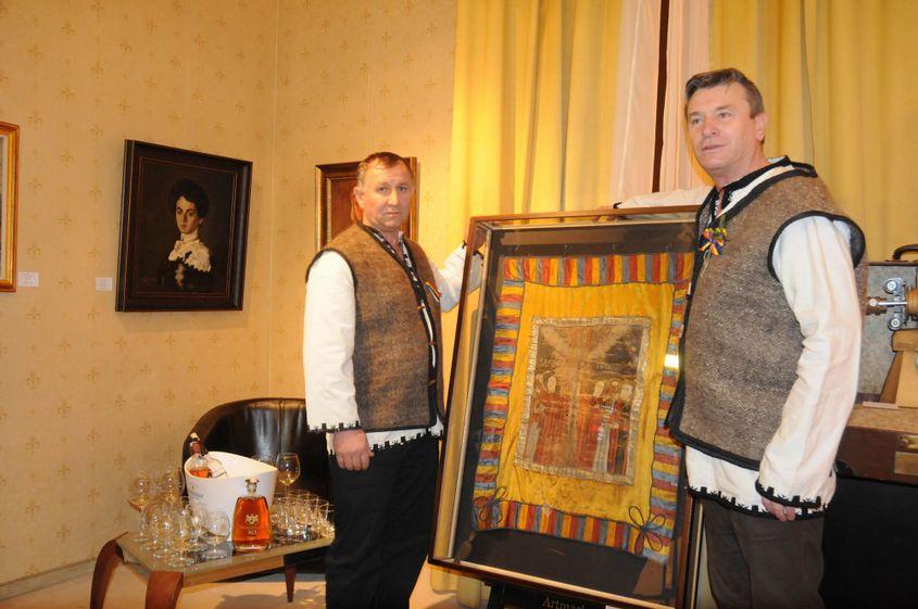 În jurul orei 19, ca din senin, lucrurile se animă. În sala principală, unde paletele galbene se înalță, când și când, pentru lucrări semnate de clasici, privirile sunt atrase de o apariție care nu are nicio legătură cu prețioasele uleiuri pe pânză: doi bărbați în straie populare.