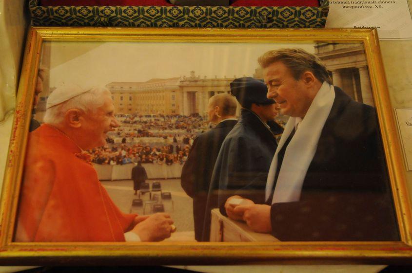 Pe o masă din marmură albă, o fotografie: Vadim Tudor, cu eșarfă albă, la întâlnirea din Piața San Pietro cu Papa Benedict al XVI-lea.
