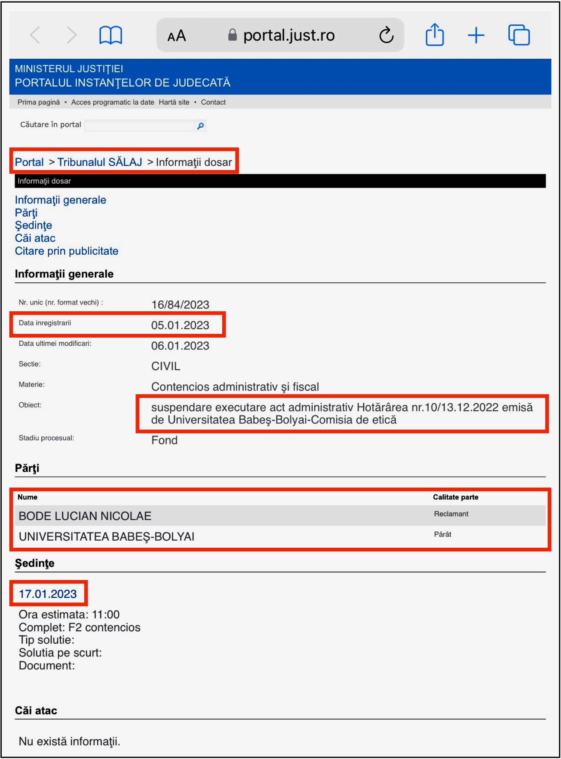 Obiectul dosarului îl constituie „suspendare executare act administrativ Hotărârea nr. 10/13.12.2022 emisă de Universitatea Babeş-Bolyai-Comisia de etică”.