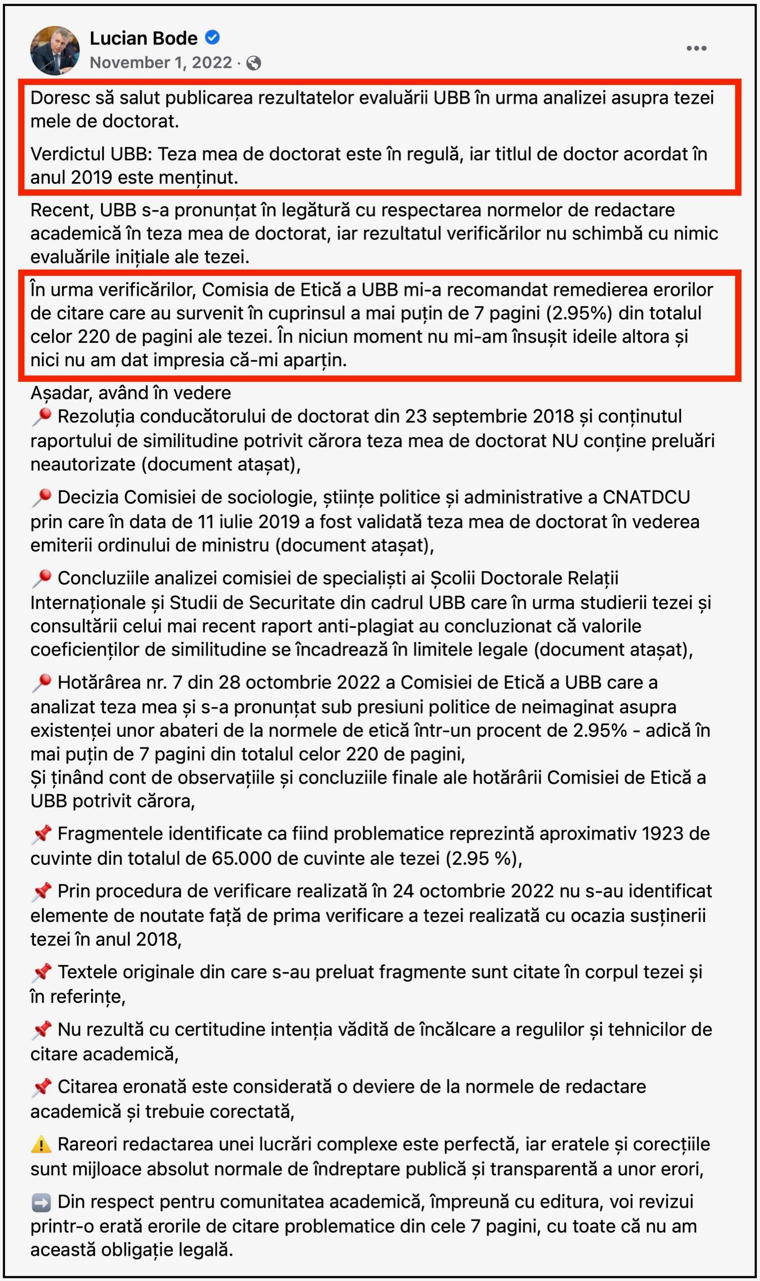 „Verdictul UBB: Teza mea de doctorat este în regulă, iar titlul de doctor acordat în anul 2019 este menținut. Recent, UBB s-a pronunțat în legătură cu respectarea normelor de redactare academică în teza mea de doctorat, iar rezultatul verificărilor nu schimbă cu nimic evaluările inițiale ale tezei”, scria Bode pe Facebook.