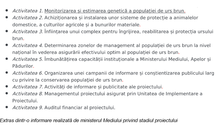 - Proiectul prevedea mai multe activități, printre care recensământul științific al urșilor bruni din România și construirea unui complex pentru îngrijirea lor.