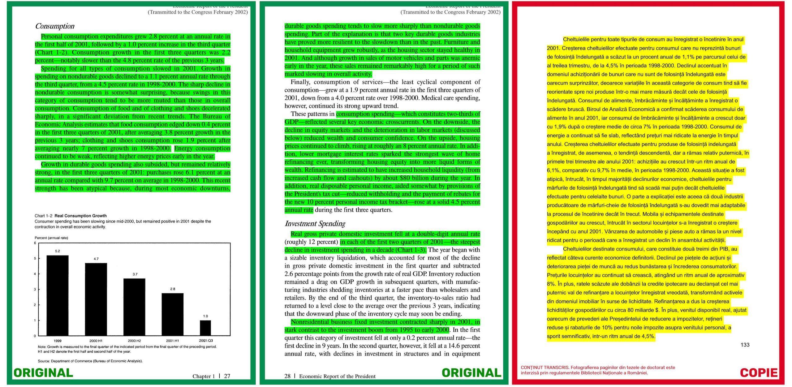 More precisely, these are three reports, entitled the same, Economic Report of the President. The first was presented to the U.S. Congress in February 1999 by President Bill Clinton, and the other two by President George W. Bush in February 2002 and February 2003, respectively. None of these works are cited in the text of Mircea Geoană's doctorate and are not listed in the bibliography.