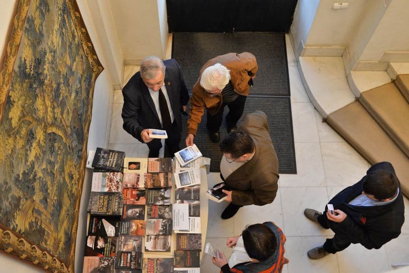 La parterul Casei Titulescu, oaspeții sunt întâmpinați de un stand cu cărţi, a cărui vedetă, în această seară, este volumul de interviuri pe care îl lansează Melinescu − Întoarcerea la românism.