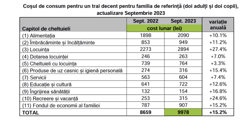Un studiu bazat pe date din septembrie 2023 al Fundației Friedrich Ebert România și Syndex România arată cum valoarea coșului minim de consum pentru un trai decent, pentru o familie formată din doi adulți și doi copii se ridică la 9.978 de lei.