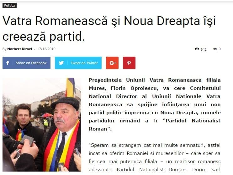 În 2010, preşedintele filialei Mureş a Uniunii Vatra Românească (UVR) declara că va solicita Comitetului Naţional Director al UVR să sprijine înfiinţarea unui nou partid împreună cu Noua Dreaptă, care urma să se numească Partidul Naționalist Român.