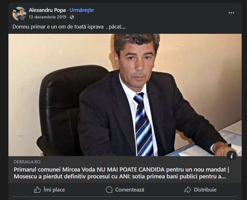 „Domnu primar e un om de toată isprava, păcat”, scria tot Popa în 2019, când Agenția Națională de Integritate i-a interzis lui Moșescu să candideze pentru că soția lui primea bani publici - chiar de la primăria pe care o conducea - pentru a asigura asistență medicală la meciuri de fotbal.