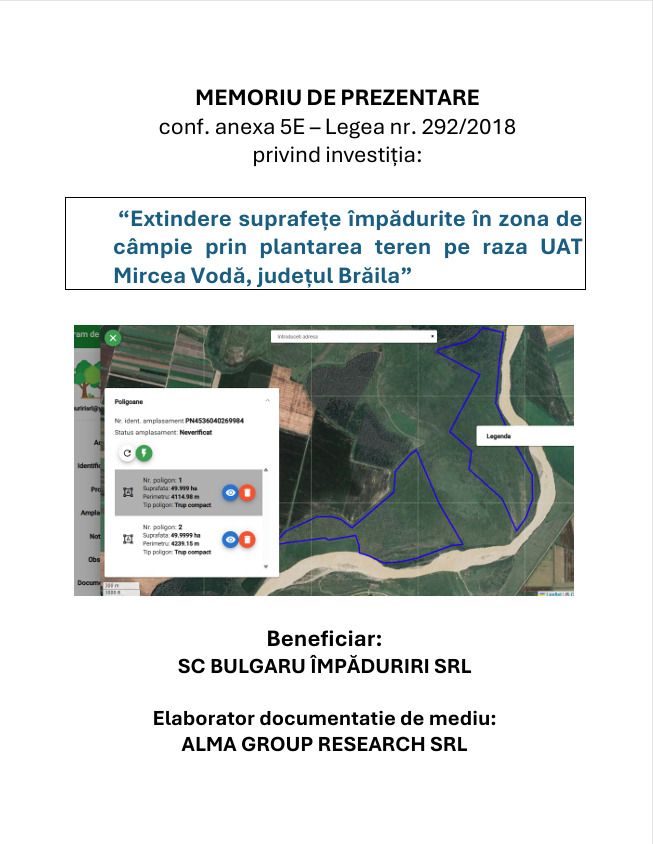 Conform documentului, Bulgaru Împăduriri va împăduri un teren agricol (de 100 de hectare, se arată într-un anunț public din mai 2025) din comuna Mircea Vodă, județul Brăila, operațiune pentru care primește o finanțare în valoare de 4,67 de milioane de lei - bani europeni. Terenul pe care se va face împădurirea se află în proprietatea privată a comunei.