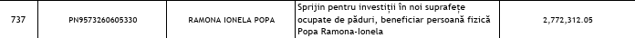 Femeia apare, într-adevăr, pe o listă intermediară de proiecte selectate de Ministerul Mediului pentru finanțare prin PNRR. Conform documentului, Ramona Ionela Popa ar urma să primească 2,77 milioane de lei, ca sprijin pentru investiții în noi suprafețe ocupate de păduri. Împădurirea ar urma să fie făcută în comuna Cireșu (localitatea de baștină a deputatului), pe o suprafață de aproximativ 60 de hectare, declară Alexandru Popa pentru PressOne.