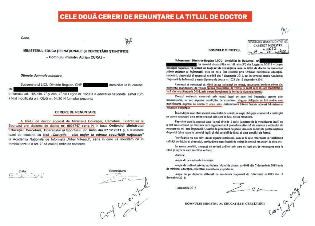 Bogdan Licu a făcut două cereri de renunțare benevolă la titlul de doctor – în martie 2016 și în octombrie 2018 ani – în baza infamei OUG 94 emisă de Sorin Cîmpeanu în primul său mandat de ministru, în decembrie 2014, pentru salvarea premierului Victor Ponta.