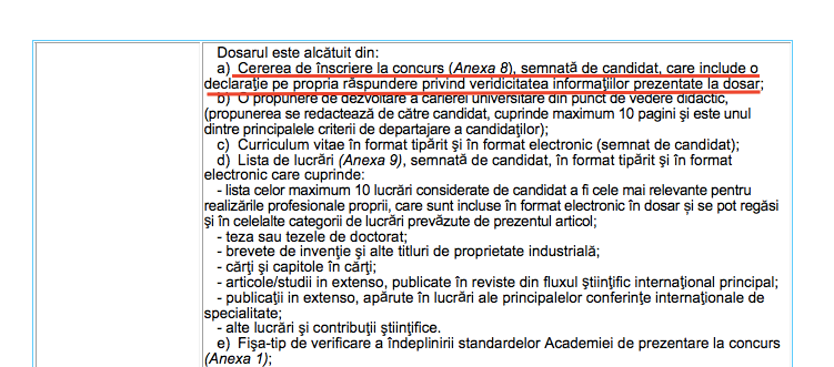 Potrivit metodologiei de concurs a ANIMV, dosarul unui candidat trebuie să cuprindă o cerere de înscriere „semnată de candidat, care include o declarație pe propria răspundere privind veridicitatea informațiilor prezentate la dosar”.