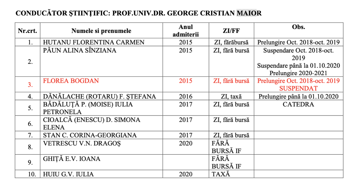 Patru dintre doctoranzii lui Maior, care ar fi trebuit să își finalizeze studiile prin susținerea publică a tezei în 2018 și 2019, figurează în prelungire de școlaritate; unora le-a expirat, însă, și prelungirea.