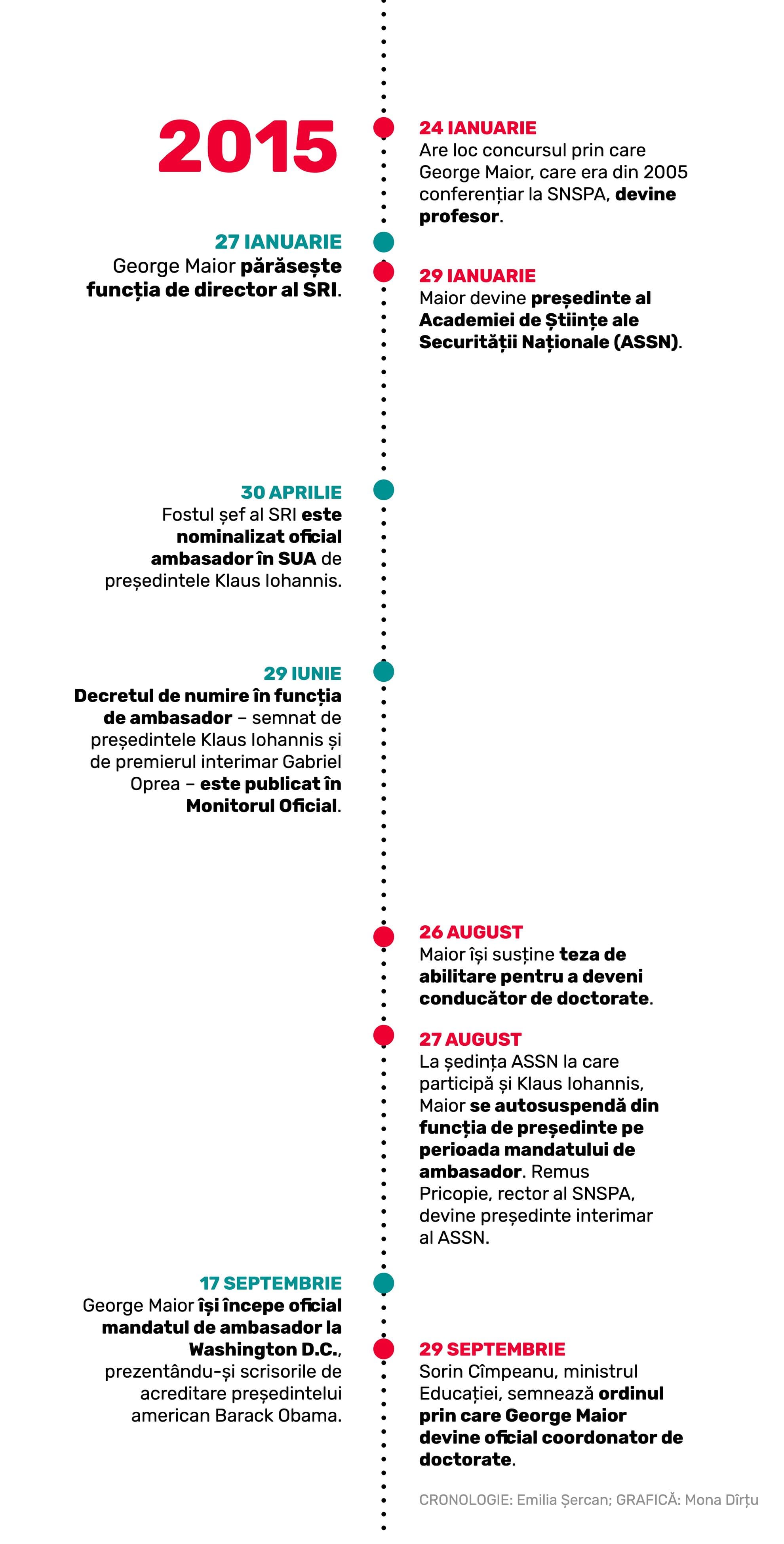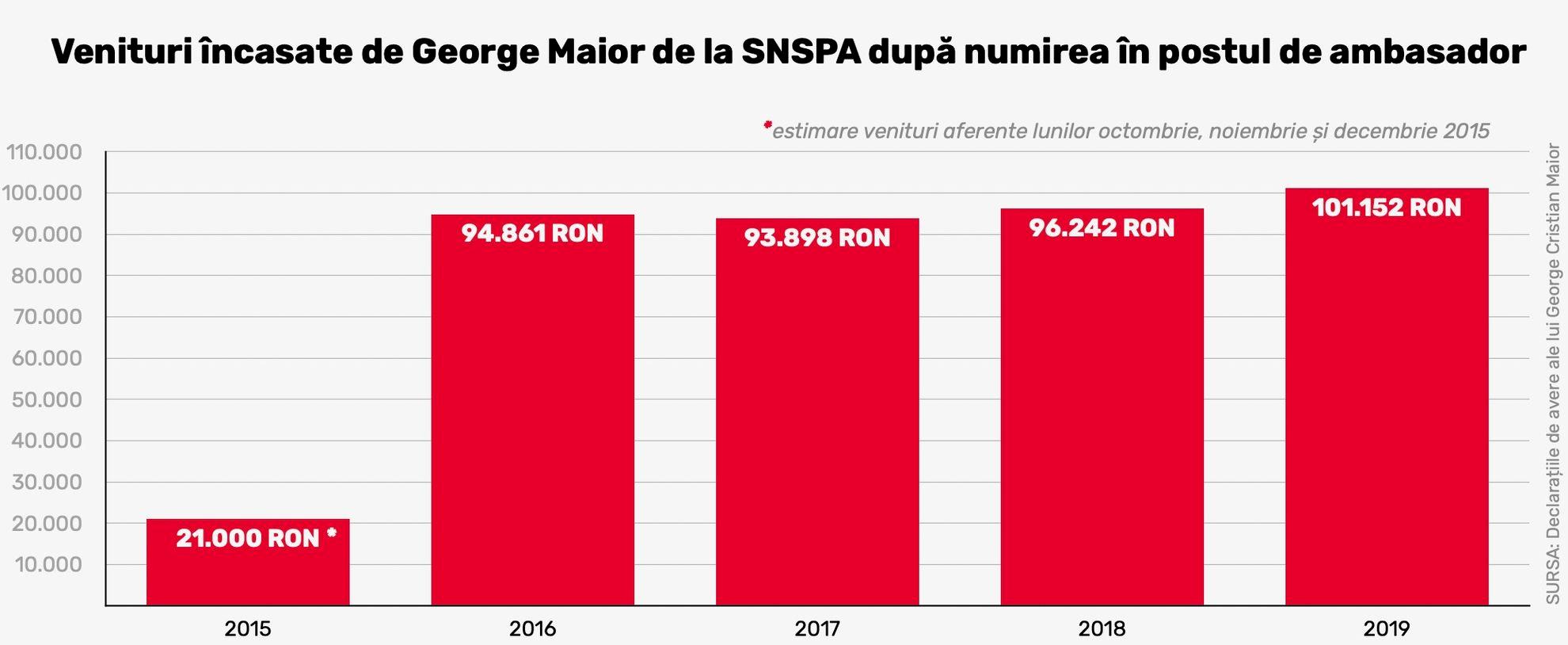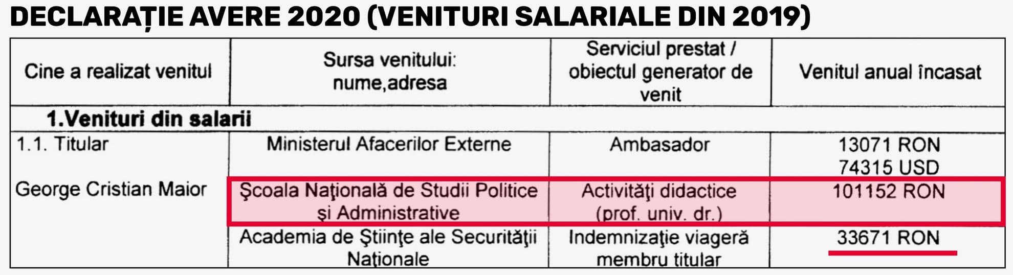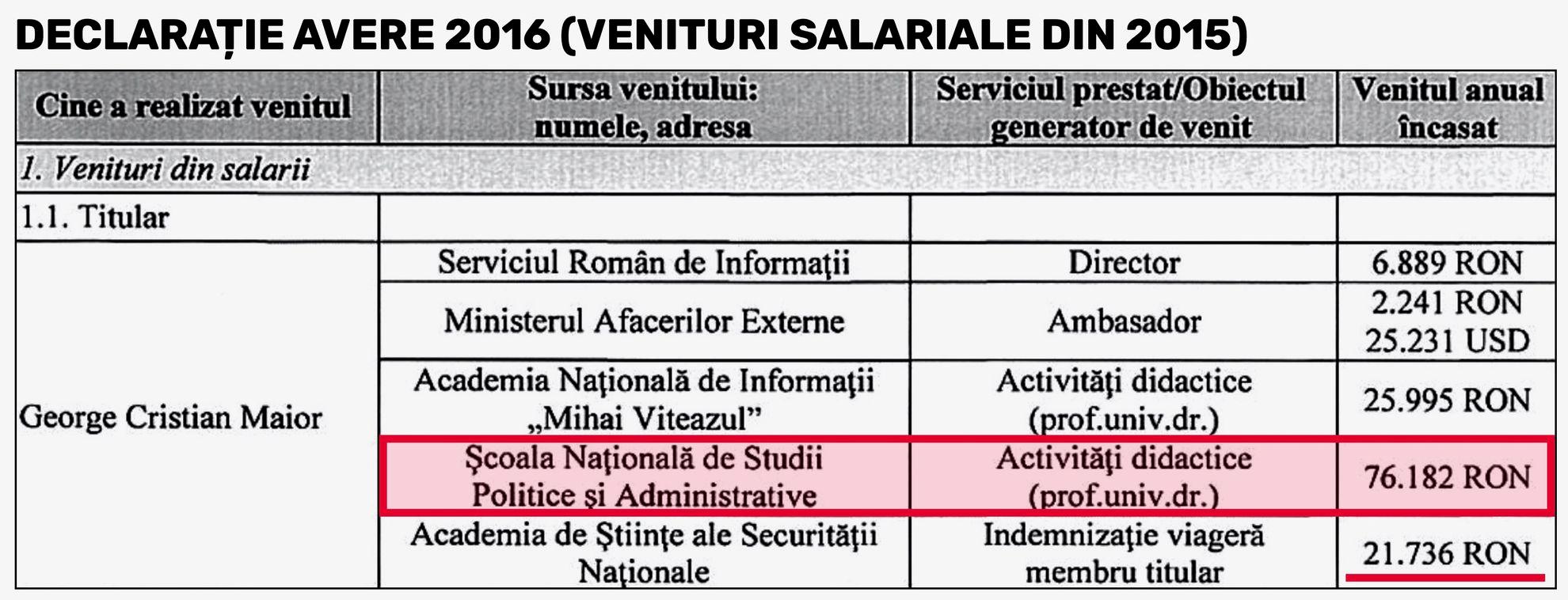 George Maior a continuat să încaseze venituri lunare cumulate de 10-11.000 lei de la SNSPA și ASSN și după 2015, an în care s-a mutat la Washington D.C. SNSPA e condusă de rectorul Remus Pricopie, care i-a succedat lui Maior – cu titlu interimar – la președinția Academiei de Științe ale Securității Naționale (ASSN).