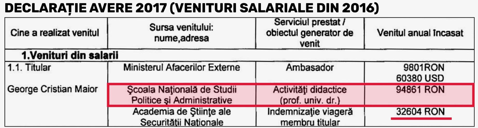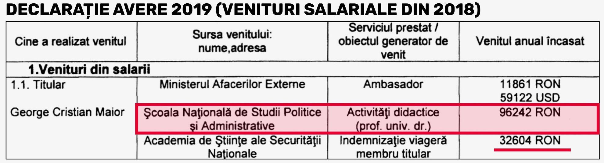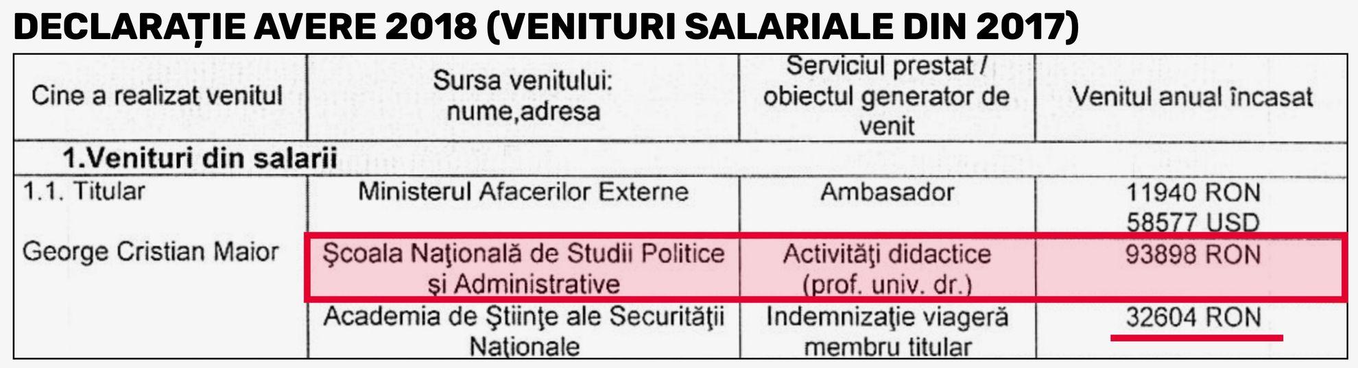 George Maior menționează în declarațiile de avere care acoperă perioada de când se află la Washington circa 400.000 de lei bani încasați de la SNSPA „pentru activități didactice”.