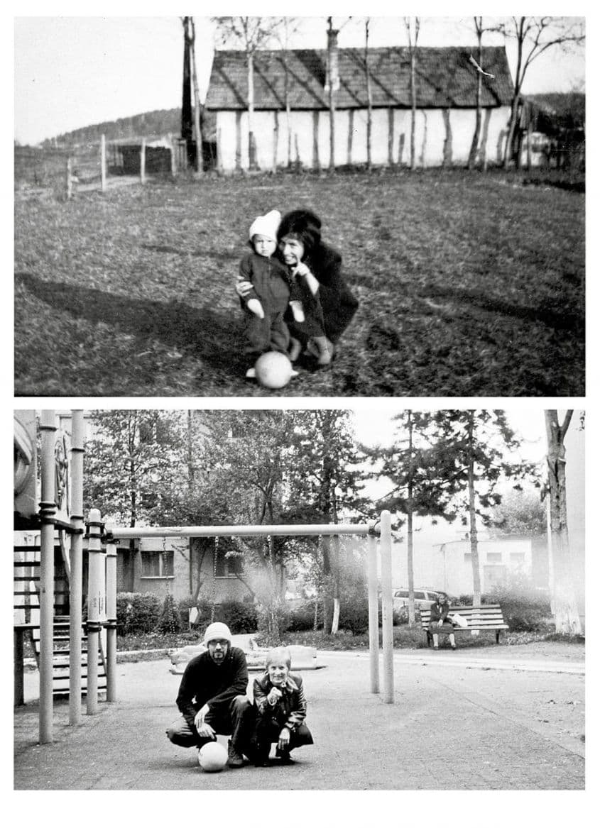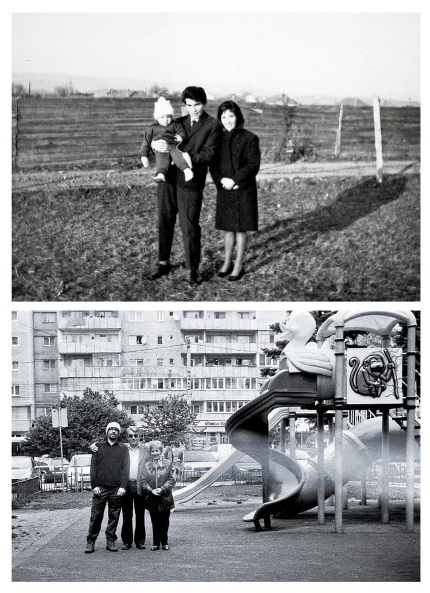 După 43 de ani de la acea imagine, am făcut rost de un aparat Smena 8 cam defect, identic celui cu care fuseseră făcute pozele de odinioară, am pus în el un film Azo expirat, i-am luat pe părinții mei din blocul de pe strada Izlazului și am refăcut cele trei imagini exact în aceleași locuri.