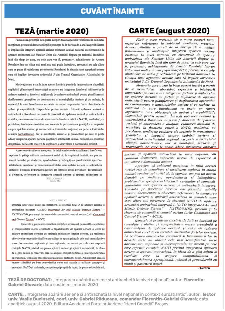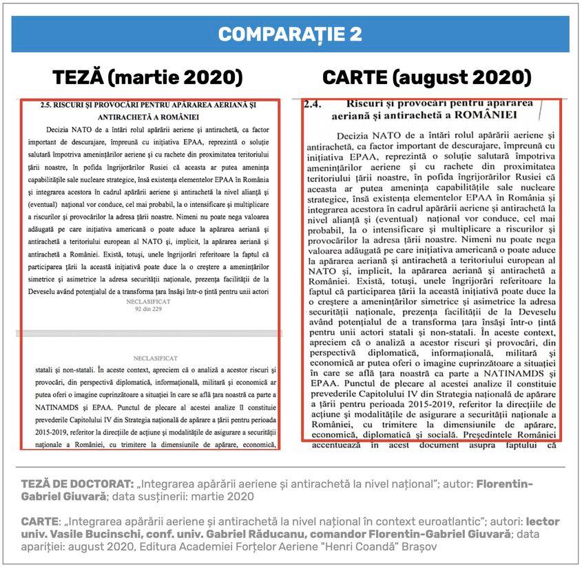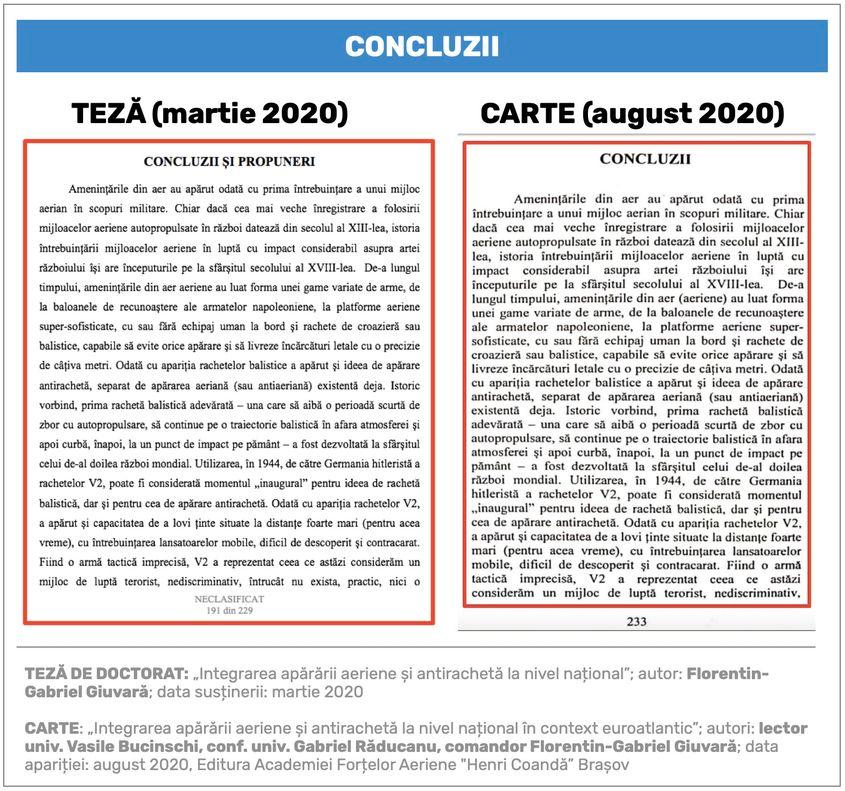 Întrebat dacă conținutul cărții pe care o semnează împreună cu Bucinschi și Giuvară este identic cu teza sa de doctorat, comandorul Florentin-Gabriel Giuvară a confirmat acest lucru, susținând că a ales publicarea tezei – la doar cinci luni după susținere – astfel încât aceasta să fie accesibilă pentru public.