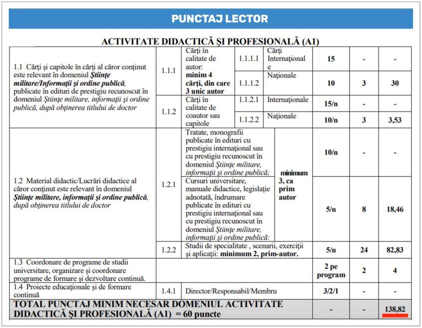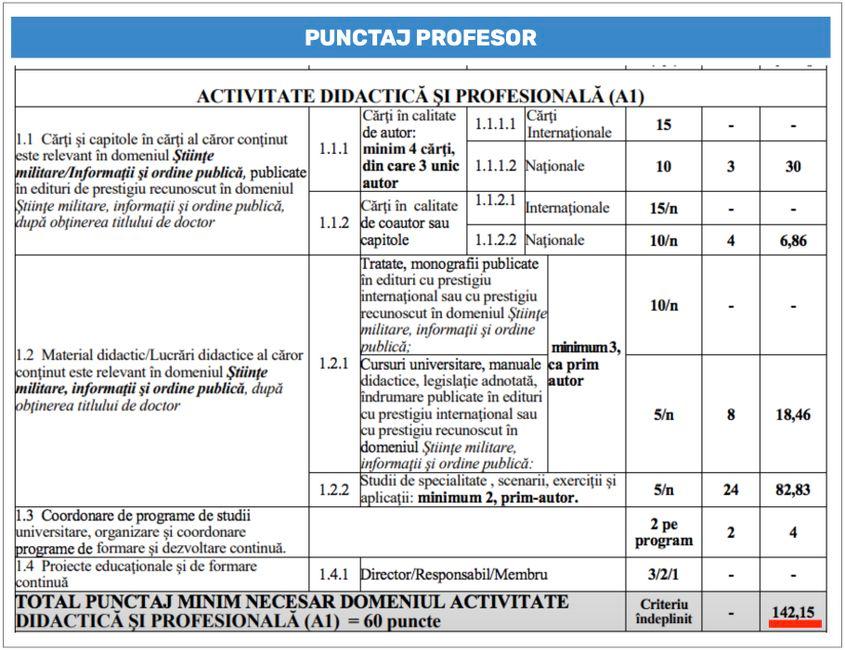 Astfel, primul criteriu pentru postul de profesor – prevăzut în anexa 26 aferentă Comisiei de Științe militare din Ordinul de ministru nr. 6.129/2016, care include standardele minimale necesare și obligatorii – precizează că un candidat trebuie să aibă „minim 4 cărți, din care 3 unic autor”.