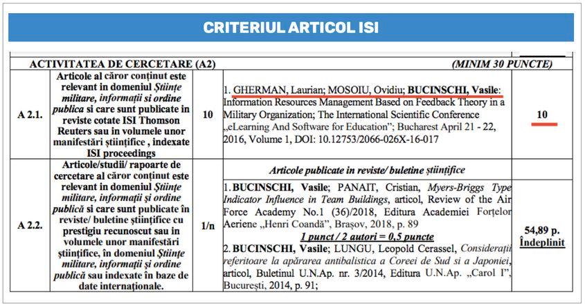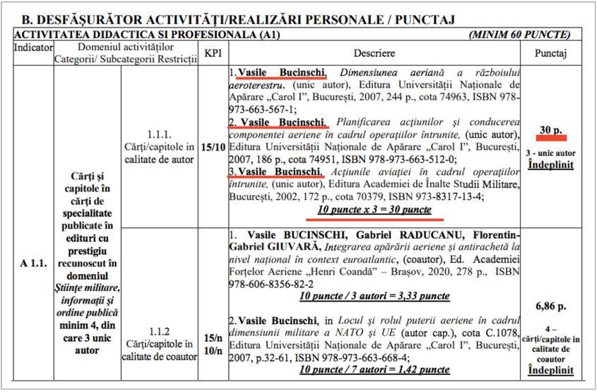 Singura modificare apărută în lista de criterii pe care Bucinschi a depus-o în luna februarie, când a obținut postul de lector, față de cea depusă acum, pentru postul de profesor, este cartea plagiată pe care o semnează împreună cu actualul rector al Academiei Forțelor Aeriene.
