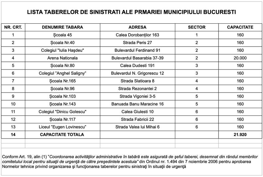 „Noi avem un adăpost sub Stadionul Național, unde am pus paturile pliante pe care le-ați văzut și la Romexpo - sunt de la această direcție paturile respective - și pături. Mai sunt adăposturi în fiecare sector, câte o sală de sport, și există o zonă de depozitare tot pentru situații de urgență. Fiecare sector are câte o sală unde sunt depozitate aceste paturi și pături pregătită pentru o eventuală situație de urgență.”