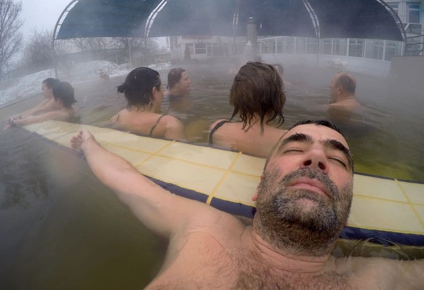 Ca experiența să fie completă, trebuie să stai la înmuiat până ți se încrețește pielea pe degete. Te miști lent, privind cu ochii mijiți printre aburi cum domni supraponderali, înarmați cu șlapi și plase ținute deasupra capului – cum țineau soldații din Vietnam pușcoacele – trec pe dinaintea ochilor tăi venind de niciunde, îndreptându-se spre nicăieri, probabil în căutarea sănătății veșnice.