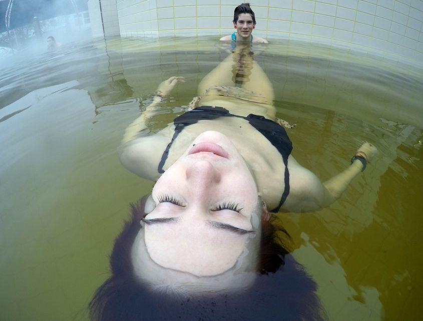 Aici, bălăceala și stropitul sunt sinonime cu Apocalipsa. Oamenii nu prea zâmbesc, fiindcă iau vindecarea foarte în serios: înfășurați în halate plușate care poartă monograma hotelului de deasupra, picotesc întinși pe șezlonguri – atât de încremeniți, încât doar sforăiturile ușoare mai trădează că sunt vii.
