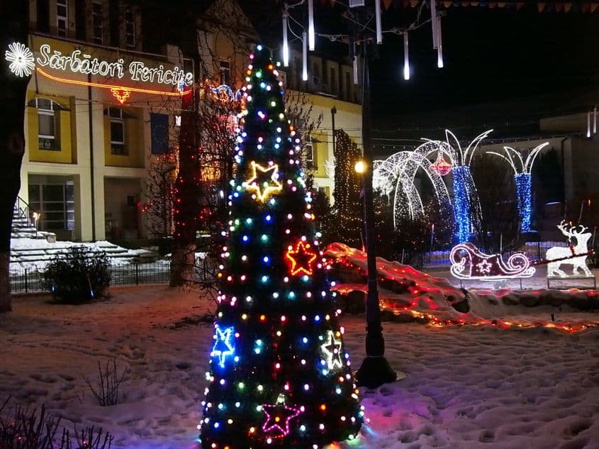 Piețele centrale sunt cuprinse de un delir luminos atât de șocant, încât te trezești călcând brusc frâna. Parcă unicornii, zânele și feții-frumoști din basme și-au dat mâna peste țară într-un efort de nestăvilit, cum numai pe comuniști îi mai apuca pe vremuri, de biruiau un cincinal în câte trei ani și jumătate.