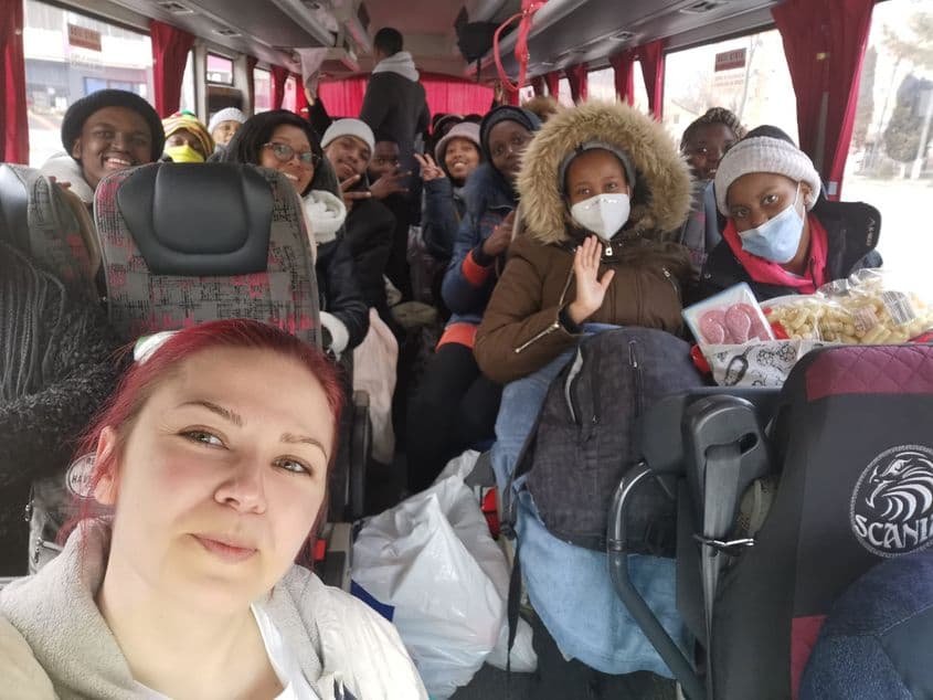 Sâmbătă, o cunoștință de pe Facebook (contactată la rândul ei de un român din Eswatini) i-a scris și a întrebat-o dacă poate să ajute un grup de studenți din Sudul Africii, care a plecat din orașul Vinnîțea și încearcă să ajungă la graniță, iar apoi are nevoie de transport pentru a ajunge la București.