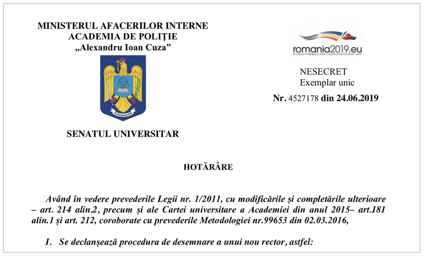 Legea mai spune că stabilirea unui nou rector trebuie făcută în cel mult trei luni de zile de la vacantarea poziției. Așa se face că, exact la o lună după demisia lui Adrian Iacob, pe 24 iunie 2019, Senatul Academiei de Poliție hotăra declanșarea procedurii de desemnare a unui nou rector și stabilea calendarul alegerilor.
