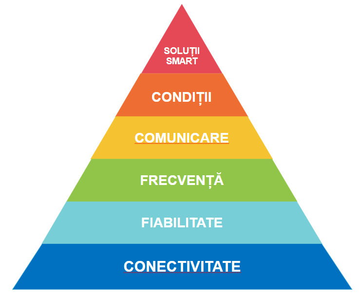 - Exact. Am făcut o Piramidă a lui Maslow (foto mai jos), care nu se referă la nevoile umane, ci la nevoile călătorului de transport public. Cele mai importante, în ordine, sunt conectivitatea, fiabilitatea, frecvența, comunicarea, condițiile de transport și la final, soluțiile smart. Soluțiile smart se clădesc deasupra celorlalte. Dacă vehiculele tale nu merg unde trebuie și nu vin întotdeauna când trebuie și oricum vin rar și n-ai hărți, n-ai site și sunt murdare, pot să fie noi și să ai aplicații, că tot serviciu jalnic se numește.