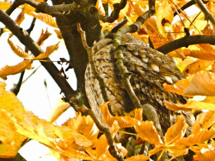 Câtă vreme castanii sunt împodobiți cu frunze, bufnițele se camuflează perfect. Te poți învârti un minut întreg în jurul copacului fără să observi vreuna.