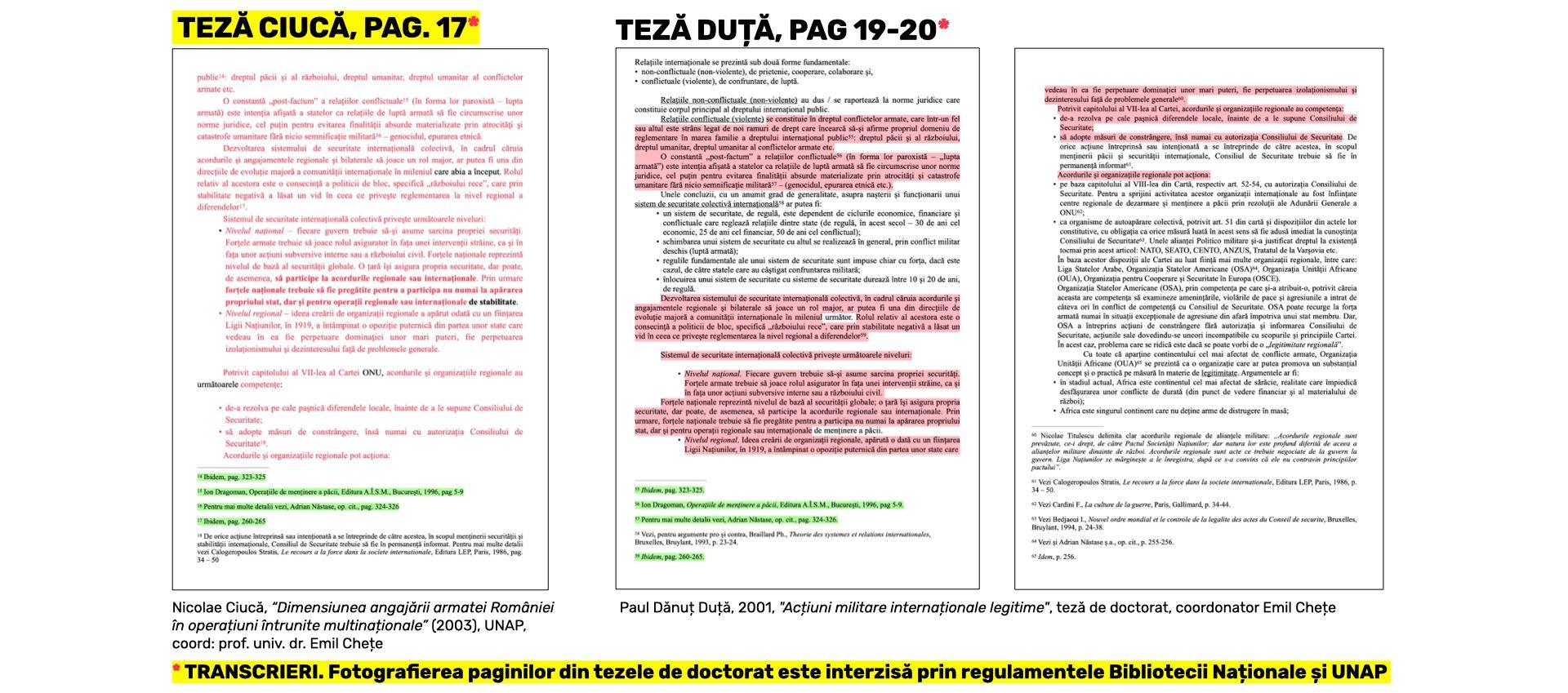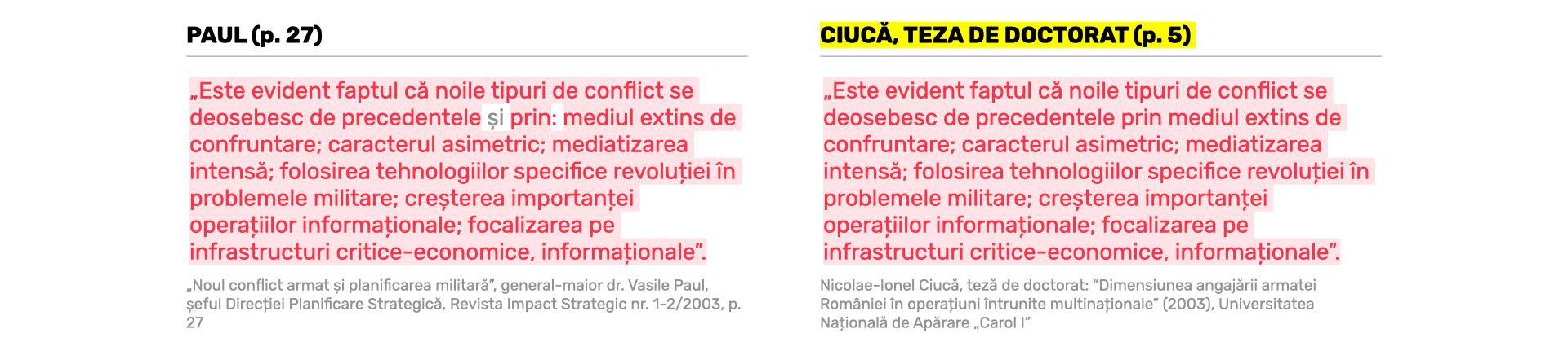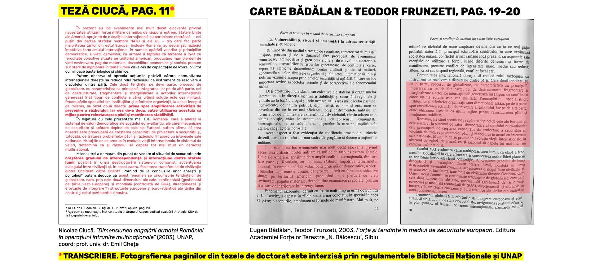 Din analiza pe care am publicat-o săptămâna trecută reiese că doctorandul Nicolae Ciucă a copiat fără citare 353 de rânduri, inclusiv pagini integrale, din volumul Forțe și tendințe în mediul de securitate european, publicat în 2003 de Eugen Bădălan și de Teodor Frunzeti, fost consilier pe probleme de apărare la Administrația Prezidențială în primul mandat al președintelui Klaus Iohannis.
