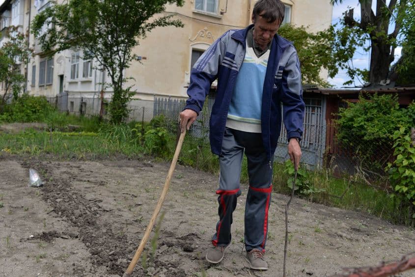 Pe drumul spre Casa de Cultură, în plin centru, îl întâlnim pe nea Ion, care sapă într-o grădină din faţa blocului său. E un bărbat topit, adus de spate, care se sprijină în cârje şi îngână cu greu cuvintele.