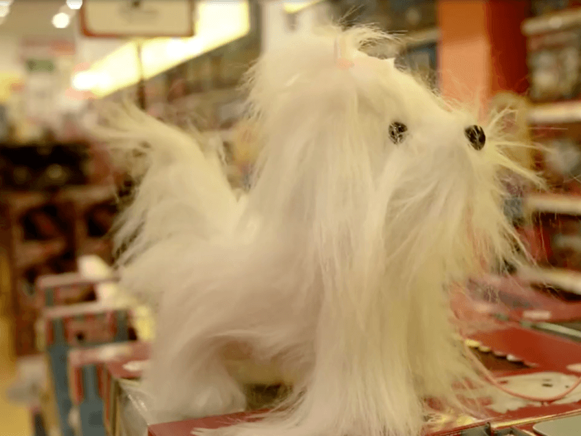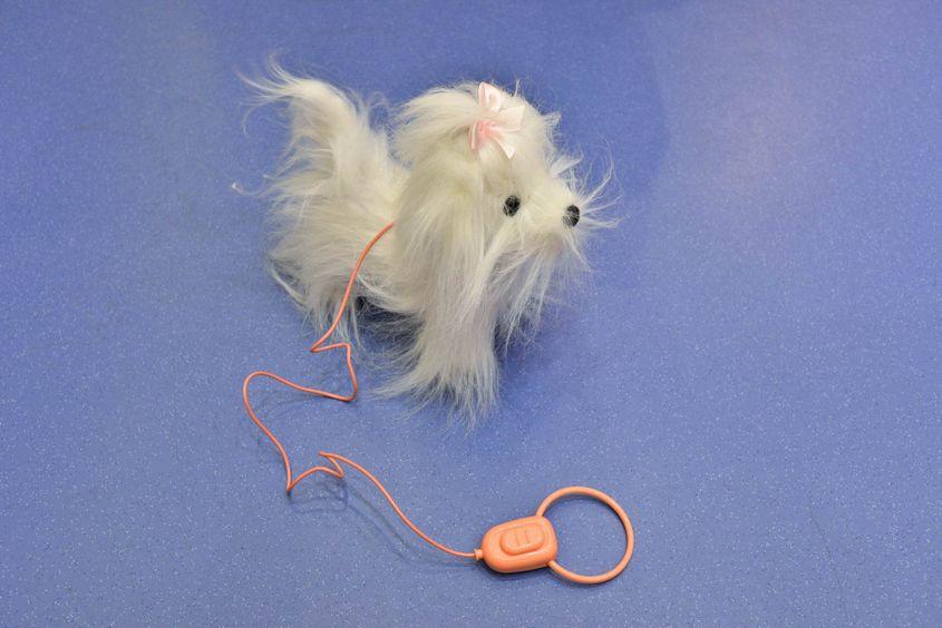 Mimi are 20 de centimetri de drăgălășenie. E dotată cu o lesă roz, prevăzută cu o mică telecomandă și două funcții: se deplasează bâțâit înainte, cu viteza unui copil care abia a învățat să meargă, sau latră comic în timp ce dă din coadă.