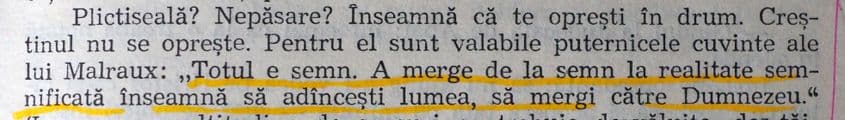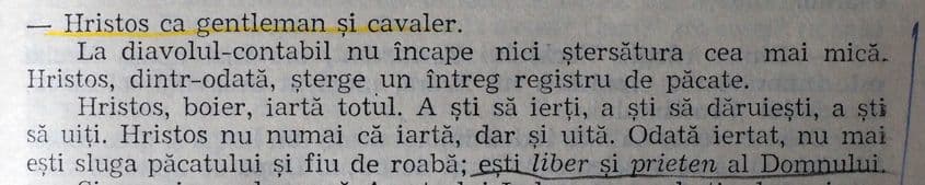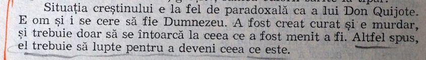 "Situația de creștin e tot una cu statutul de aristocrat. De ce? Pentru că își are temeiul în cele mai "seniorale" însușiri: libertatea și încrederea (credința). Ce este nobilul, feudalul? Mai presus de orice, un om liber. Ce înseamnă credința? Încredere în Domnul, deși lumea e rea, în ciuda nedreptății, în pofida josniciei, cu toate că de pretutindeni nu vin decât semnale negative."