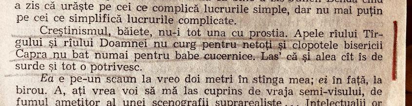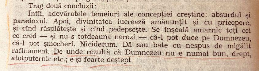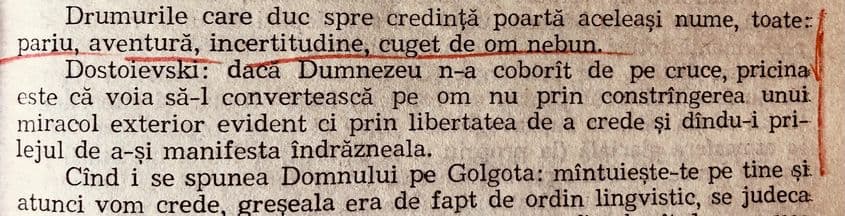 „Numai creştin fiind mă vizitează - în pofida oricărei raţiuni - fericirea, ciudat ghelir. Numai datorită creştinismului nu umblu - crispat, jignit, pe străzile diurne, nocturne ale oraşului (...) Creştinismul mă păstrează cu ceva tineresc în mine şi neplictisit, nedezamăgit, nescârbit, nesupărat. Prezenţei veşnic proaspete a lui Hristos îi datorez să nu dospesc şi nu fermentez în supărarea pe alţii şi pe mine.”