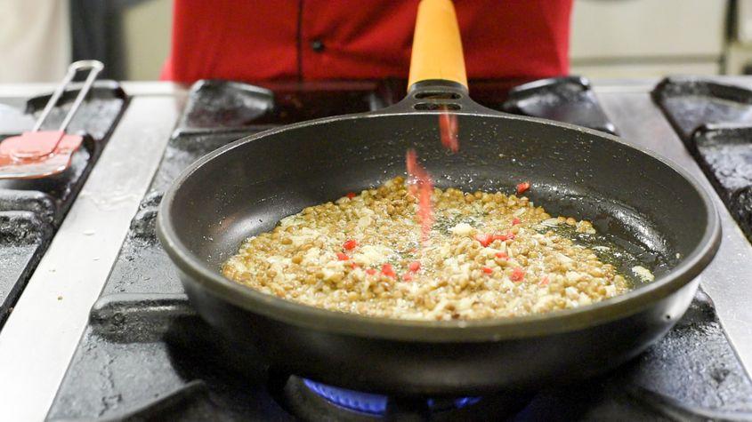 Lintea: Se pune o tigaie cu ulei la încins, se adaugă ceapa tăiată mărunt și se lasă la călit împreună cu chilli, după care se adaugă usturoiul și se stinge cu coniac. După ce coniacul se reduce puțin, se adaugă lintea și supa bază de creveți. Se lasă la redus până scade zeama și se adaugă unt și pătrunjel.
