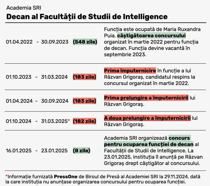 Potrivit Biroului de presă al Academiei SRI, împuternicirea lui Răzvan Grigoraș a fost prelungită de două ori, la 1 aprilie și la 1a 10 octombrie 2024, deși legea permite ca o persoană să ocupe o funcție publică prin împuternicire doar un an.