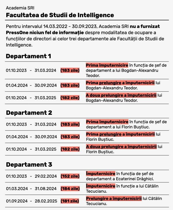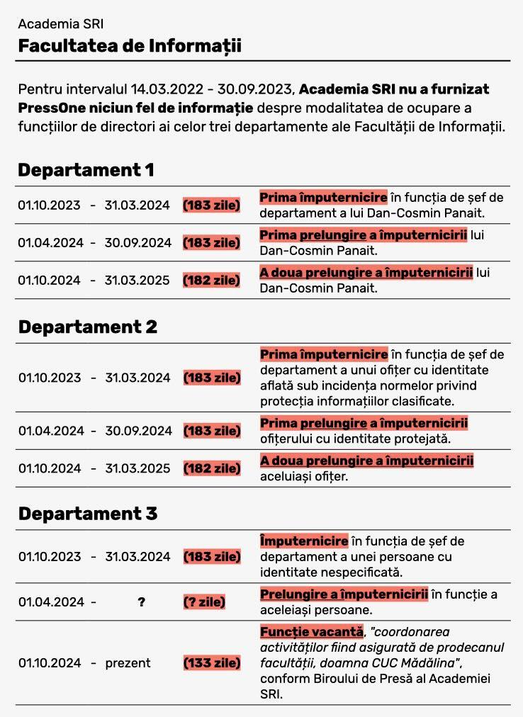 După o primă solicitare oficială de informații trimisă în noiembrie 2024, prin care am cerut date despre modalitatea de ocupare a funcțiilor în instituție, Academia SRI a organizat rapid concursuri pentru funcțiile de decan, iar într-un al doilea răspuns a confirmat că aceste posturi sunt acum ocupate prin concurs. Cu toate acestea, instituția nu a oferit nicio explicație pentru perioada îndelungată în care funcțiile de conducere au fost ocupate ilegal, prin împuterniciri repetate.