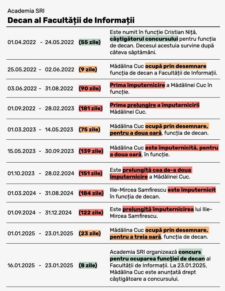 Astfel, timp de șase luni, între 1 iulie 2024 și 23 ianuarie 2025, niciuna dintre funcțiile de conducere din Academia SRI – rector, decani și directori de departamente – nu a fost ocupată prin concurs, respectiv alegeri interne, toate funcțiile fiind exercitate fie prin împuternicire, fie prin desemnare.