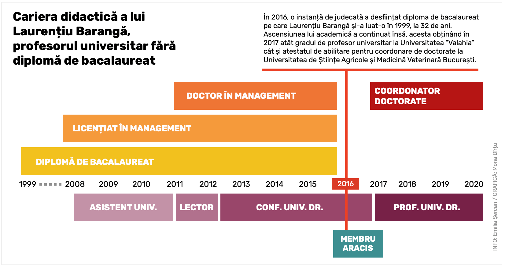 În schimb, la exact un an după ce Curtea de Apel București i-a anulat diploma de bacalaureat, Laurențiu Barangă a ajuns în vârful ierarhiei universitare devenind profesor universitar la Universitatea „Valahia” din Târgoviște și conducător de doctorate la Universitatea de Științe Agricole și Medicină Veterinară (USAMV) din București, ambele universități de stat.