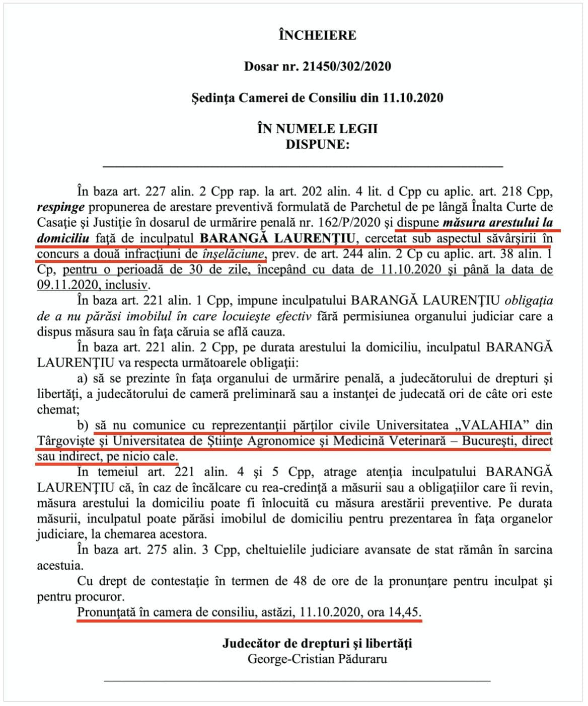 La patru ore după dialogul cu Sorin Cîmpeanu, o instanță din București a dispus măsura arestului la domiciliu pentru 30 de zile împotriva lui Barangă, căruia i-a interzis să comunice „direct sau indirect, pe nicio cale” cu reprezentanți ai Universității „Valahia” și ai Universității de Științe Agronomice și Medicină Veterinară.