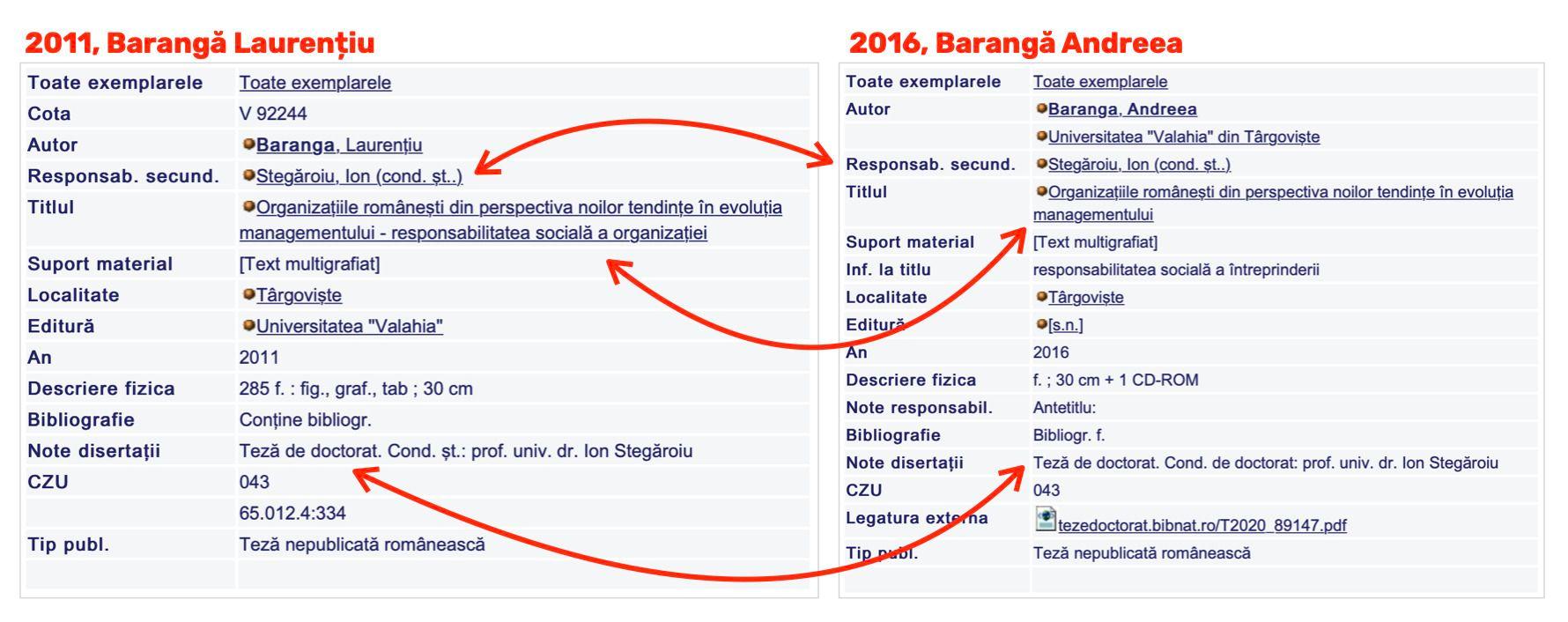Surprizele legate de cariera academică a lui Laurențiu Barangă nu se opresc aici. Pe site-ul Bibliotecii Naționale figurează două teze de doctorat cu titluri identice, susținute la aceeași universitate și având același coordonator de doctorat. Diferă doar prenumele doctoranzilor: Laurențiu și Andreea.