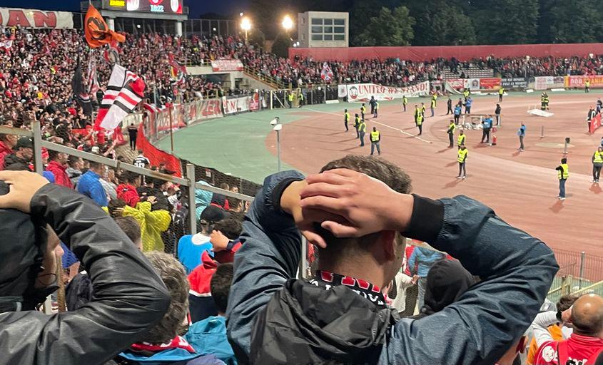 Niciodată timpul nu a trecut atât de repede pentru suporterii lui Dinamo. Cu fiecare minut care trece scade și optimismul. Se aude mai întâi un murmur, ca din măruntaiele stadionului, ca și cum arena ar avea o indigestie. Murmurul devine țipăt. „Bă, ești nebun!?” se aude de peste tot. Din peluză zboară niște rachete de semnalizare. Câteva zeci de jandarmi fac deja coridoare. Potopul de la meteo nu a venit, dar noi, dinamoviștii, avem propriul nostru potop.
