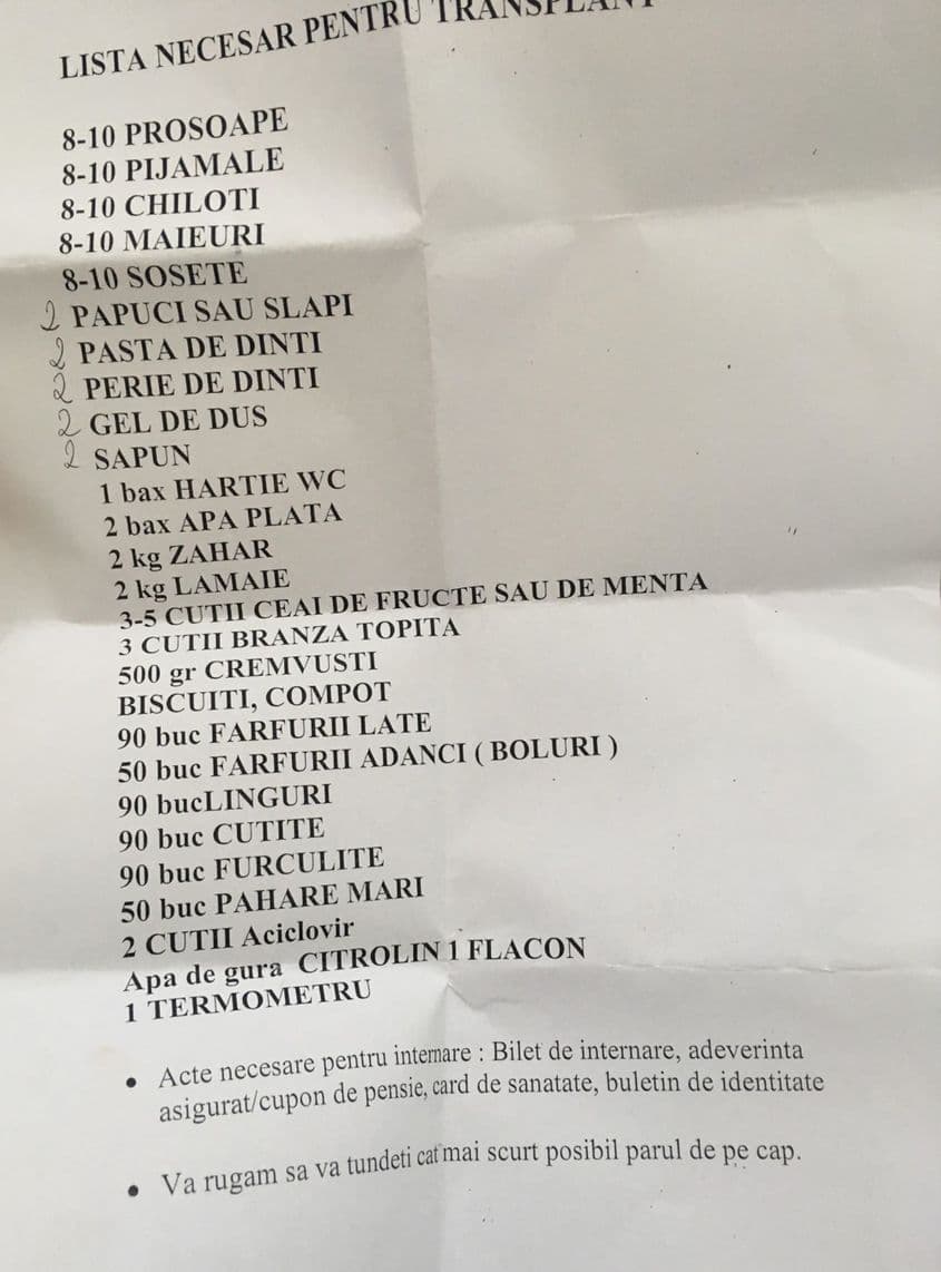 Listă pentru transplant: "500 de grame de crenvurști, 3 cutii brânză topită, un bax de hârtie igienică..."