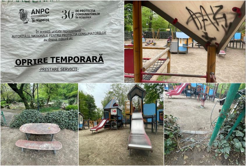 „ANPC te respectă. În această unitate reprezentanții Autorității Naționale pentru Protecția Consumatorilor au dispus măsura de Oprire Temporară” - scrie pe o hârtie căzută de la vânt și ploaie, lipită la intrarea într-un loc de joacă din Parcul Cișmigiu, administrat de PMB.
