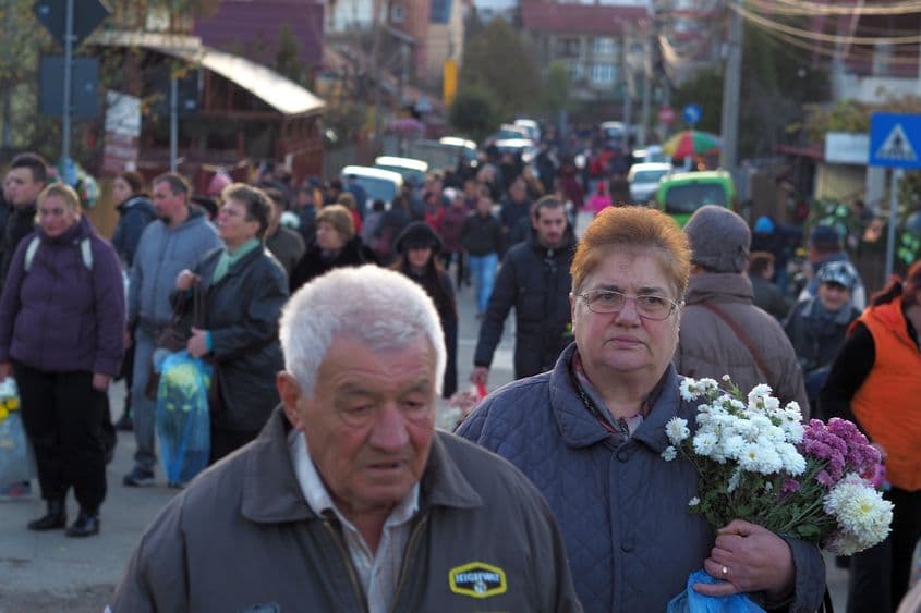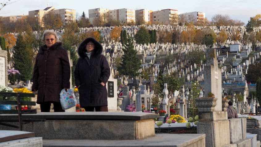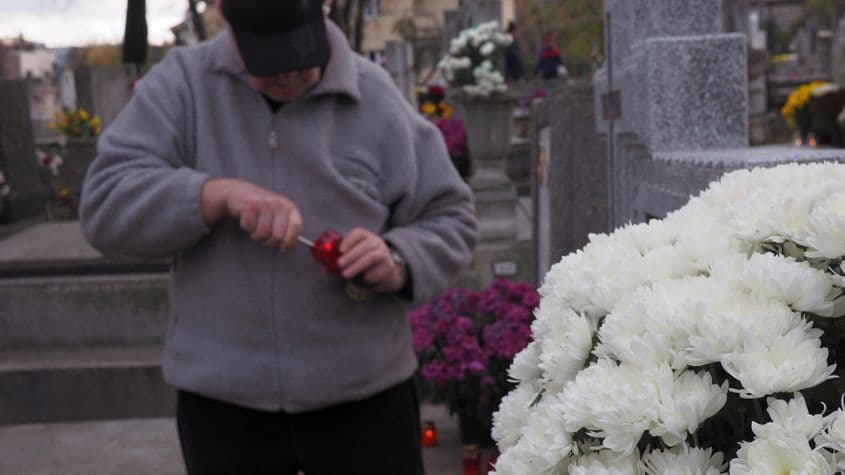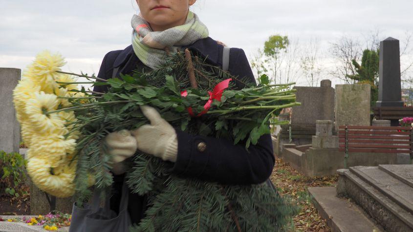 Domni cu pălărie, în costume demodate, sapă morminte, adună frunze, fac curat în jur. Doamne cu paltoane, înarmate cu măturici, candele și plase pline de crizanteme, își riscă pielea trecând pe roșu, doar pentru a urca mai iute spre cimitir.